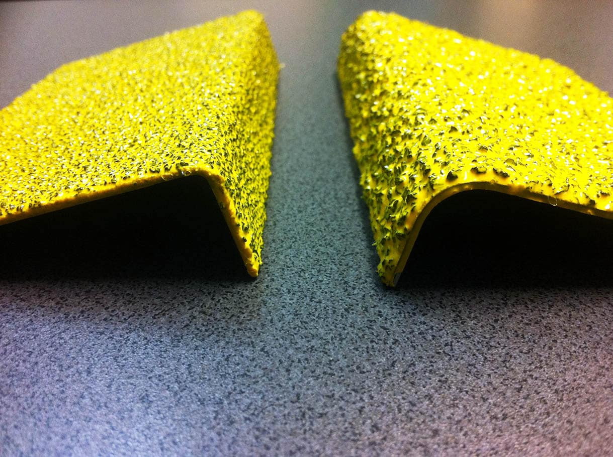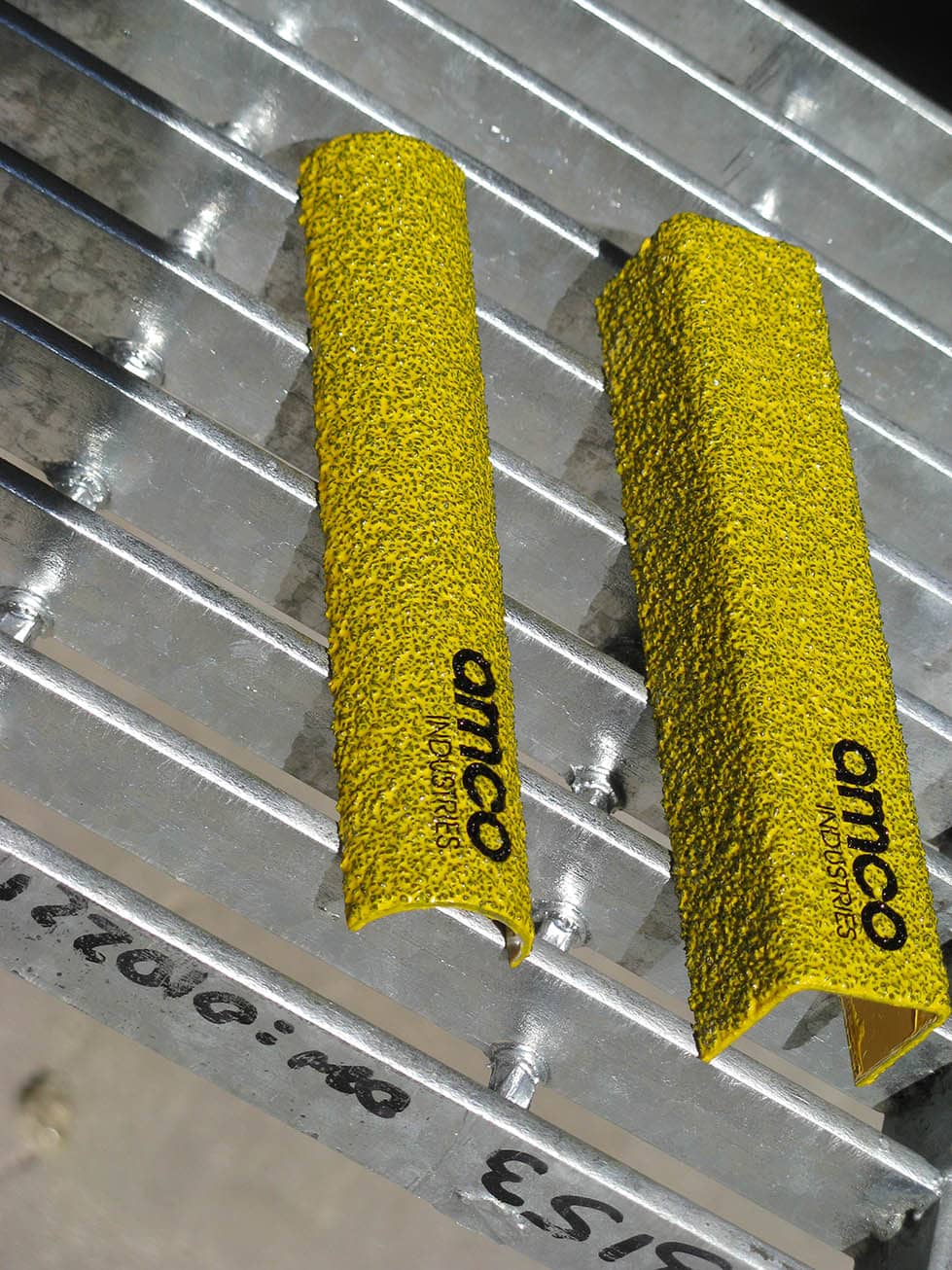 Traditionally, anti slip bull nosings are fitted onto step treads made of concrete, open type grid, chequer plate etc. Typically, they do not have a right angle at the front leading edge of the step. The have a Bull Nosing radius not a sharp 90 degrees angle as seen in most anti slip stair nosings used in mining, marine and heavy industrial areas.