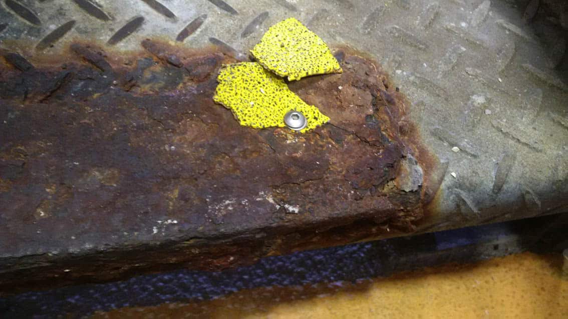 Slip, who works at a food manufacturing plant, starts. “We did a rush job on this floor in our production area. We applied a non slip brushable coating onto a metal sheet thinking it was a cheaper alternative to buying locally manufactured steel anti slip stair nosings. And, as you can see, the non slip component (coloured yellow) has delaminated badly. Almost gone. After a few months it is no longer any use, as this is just bare metal showing and dangerously slippery.”