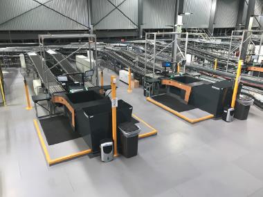 A section of Woolworths’ distribution centre, showing an impressive array of conveyor systems. Our mats are located at the GTP stations.