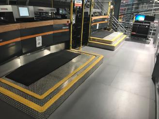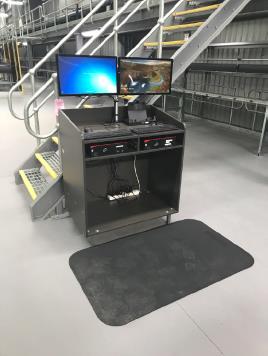 Custom-sized Orthomaster #1 anti fatigue mat (trapezium shape) to suit paltform shape. Note: foreground platform is level with base platform. Background shows the platform raised.