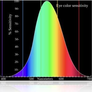 We note from the chart that the curve peaks at 555 nanometers. This means that under normal lighting conditions, the eye is most sensitive to a yellowish-green color. When the light levels drop to near total darkness, the response of the eye changes significantly as shown by the scotopic response curve on the left. Ok, so we get technical here. We include an eye sensitivity chart (see below). The left side refers to near darkness proceeding to the right section of the chart, which shows normal light.